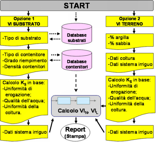Il progetto IRRIFLORVIVA ha sviluppato due software: - IRRIVIVA CONTROLLER, disponibile solo con l’acquisto della centralina IRRIVIVA, necessario per visualizzare i dati climatici della stazione meteorologica attualmente installata presso il Centro Sperimentale per il Vivaismo (CESPEVI). Il software IRRIVIVA, grazie allo scambio di dati fra la memoria della centralina irrigua IRRIVIVA ed un server dedicato, permette di memorizzare in automatico i volumi irrigui giornalieri distribuiti sui vari settori irrigui. Inoltre permette all’agricoltore di inserire manualmente alcune informazioni relative alle piante presenti in ciascun settore irriguo (specie, varietà e tipo di vaso/substrato utilizzato; dimensioni della pianta, frazione di lisciviazione) in modo da costruire un database storico dei consumi idrici delle varie colture, in base anche alle dimensioni delle piante. ![]() Home page del software IRRIVIVA CONTROLLER, che visualizza le condizioni climatiche in tempo reale rilevate dalla centralina meteo installata presso il CE.SPE.VI., a Pistoia. ![]() Pagina del software IRRIVIVA CONTROLLER, dove l’operatore può inserire i dati della coltura in modo da creare un database aziendale dei consumi idrici delle varie colture in funzione delle loro dimensioni. - CAL-VIR, (calcolatore del volume irriguo ottimale) è un foglio elettronico di Excel® per il calcolo del volume irriguo netto e lordo ottimale di colture in contenitore (opzione 1) o in suolo (opzione 2), ideato e realizzato da Carlo Bibbiani e Luca Incrocci (Università di Pisa). Attraverso un percorso guidata tipo WIZARD, l’utente deve selezionare diversi parametri in successive finestre di dialogo in modo da calcolare in automatico il volume irriguo netto (VIN), il volume irriguo lordo (VIL) e il tempo di erogazione, in base all’efficienza nell’erogazione del sistema irriguo adottato, alla qualità dell’acqua irrigua e alla uniformità della coltura . Nella figura sottostante è riportato il diagramma di flusso di CAL-VIR. Per agevolare l’utilizzo da parte dei tecnici, il software ha due database, estendibili e modificabili dall’utente: uno contiene i dati della curva di ritenzione idrica di vari substrati, mentre l’altro raccoglie i dati di volume, altezza e dei diametri delle due basi di più di 250 differenti tipi di contenitori, rilevati dai cataloghi delle principali ditte produttrici in Italia.